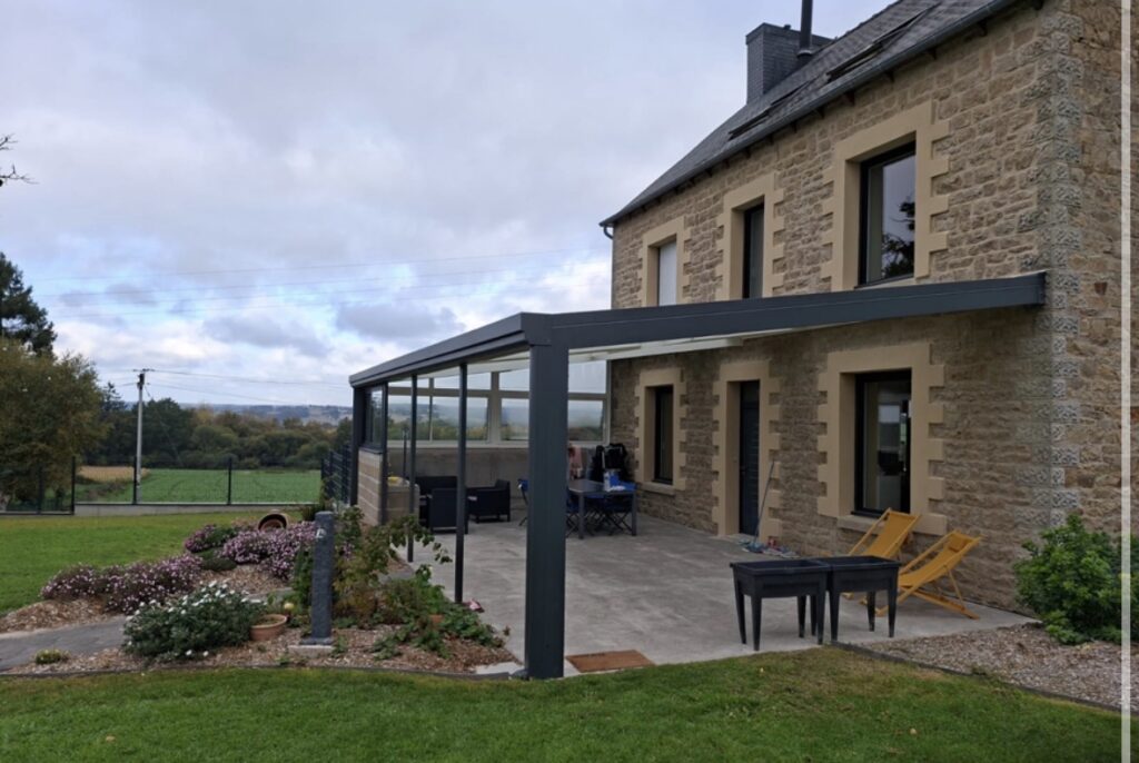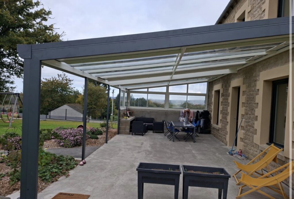 Réalisation d’une pergola luminov sur la commune de Plouguernével dans les Cotes d’Armor (22). Cette pergola en aluminium gris anthracite est constituée d’une toiture entièrement vitrée, de stores motorisés et d’un brise soleil.